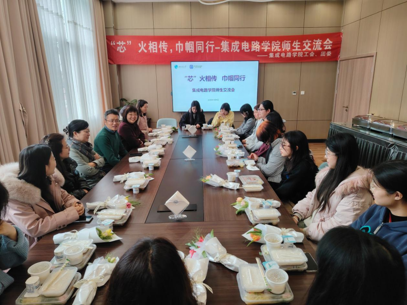 集成电路学院工会与团委携手举办了 “‘芯’火相传,巾帼同行 —— 集成电路学院师生交流会”。学院党委书记赵舵、常务副院长郝莉、党委副书记王燕与全体女教师、女学生相聚一堂,在共享午餐的温馨氛围中,深入交流,共话未来。