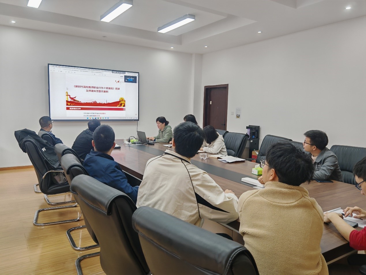 首先,学院常务副院长郝莉向全体教职工解读了《新时代高校教师职业行为十项准则》并根据教职工人员分类,有针对性地开展了警示教育。对于教师群体,郝莉重点在科研项目投标、师德师风、科技评奖、科研经费管理、非职务违法犯罪等方面进行了专门讲解;对于管理群体,郝莉表示要将失职渎职、违反决策程序决策、违反中央八项规定精神和“四风”问题、群众身边的微腐败、非职务违法犯罪等作为重点监督内容,提高全院教职工的廉洁和纪律意识。